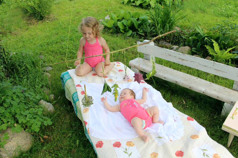 Я уже показывала наш псевдо эко немобильный мобиль, очень прижился у нас. На него подвешиваем все, что пожелается, тот же дергунчик или погремушки.