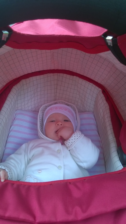 как куда в поликлинику)) сдавать кровь. Сделали моей крошке вавку на пальчике, хотя, она даже не поняла что это было и зачем ей вообще пальчик жмут. Ну ради приличия погнула губку и всхлипнула разика два. Покормила ее и отправились гулять).