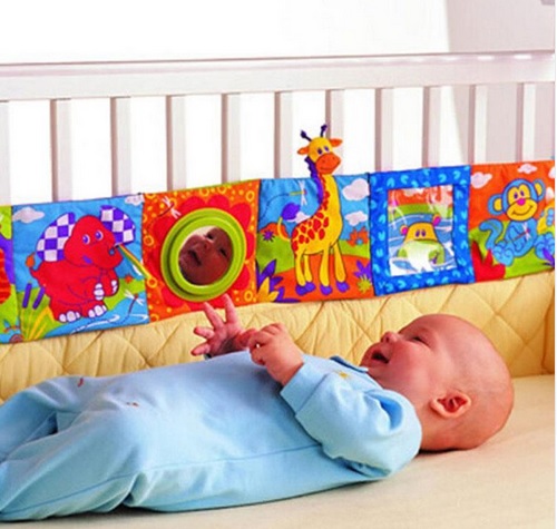 Заказала на алиэкспресс. На одной стороне черно-белые картинки, на другой - цветные, есть разные текстуры, шуршит, зеркальце правда так себе. Книжка у нас не висит в кроватке, а просто лежит на коврике, дочка ее мнет, гладит или просто картинки разглядывает.