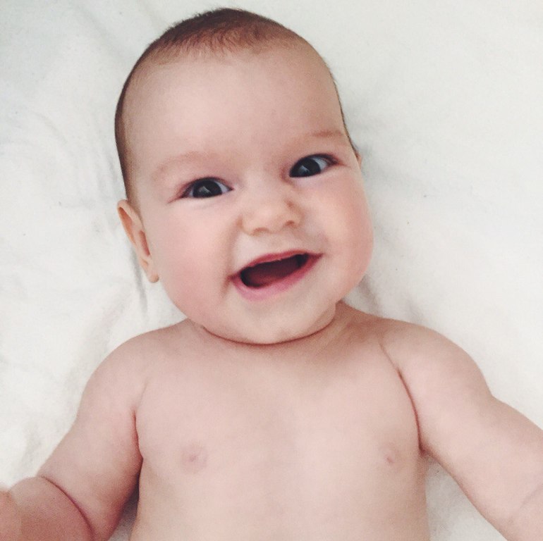 смеется, когда ее щекочешь или целуешь в ушко. но заливистого смеха пока нет. есть сдержанное "ха. ха", я его интерпретирую как "мама, это была неплохая попытка, но must try harder".