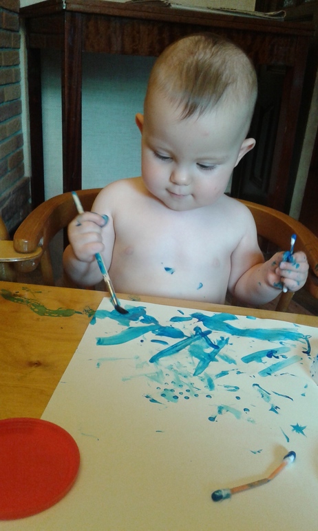 Наконец-то, его заинтересовало высокое искусство ))) сколько бы я ни пыталась подсунуть ему разные карандаши, специальные мелки или краски, всё оставалось без должного внимания. Единственное - мелки оказались достаточно вкусными ) купила пальчиковые краски. Начитавшись страшилок о неотмывшихся синих стульчиках, решила не скупиться и взять чуть дороже фирмы idigo. И не разочаровалась. Отлично отмывается на раз. Первое знакомство не вызвало интереса. Но в этот раз решила дать ему кисточку, которой он очень любит возякать по всем поверхностям! И всё получилось! Он с таким интересом возил ей по листу, меняя даже нажим, потом перешёл на стол и увлёкся совершенно ) ну и я осталась очень довольной ) это значит, что скоро будем всем бабушкам открытки рисовать )))