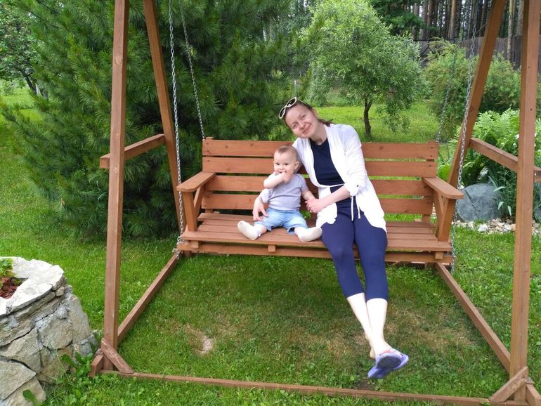 Два вечера засыпали во дворе на качели. Было так здорово -прохладно, лес рядом, воздух такой чистый, фонарики у дома и мы, устроившиеся в качельке.