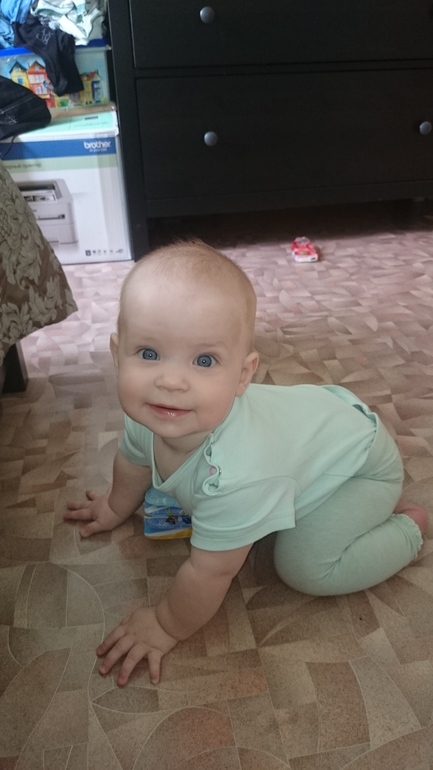 Стала говорить "бабаба" "бу", это из нового. Жду, когда начнет говорить"мамама", пока только когда плачет, что-то подобное выходит))) Ползает теперь по всей квартире, любит ползти за мной и радуется, когда находит меня за поворотом