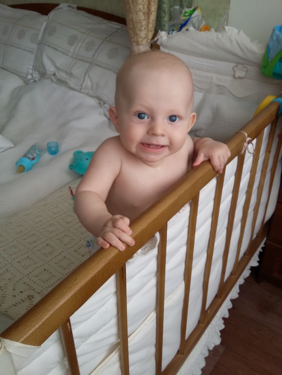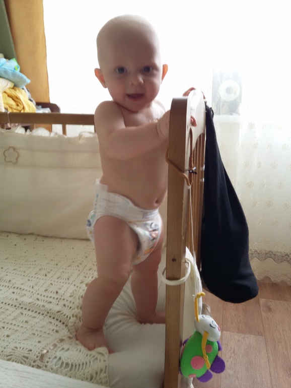 И, кстати, в связи с такой активностью (и падениями) пришлось улучшать детский игровой коврик для ползания - коврик в пододеяльник, туда же 2 одеяла - и не так страшно смотреть на каждое падение головой.