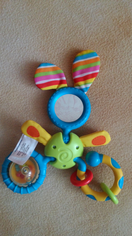 Есть ещё от фишер прайс Бубен, купила я его совсем недорого, он мне на первый взгляд совсем не понравился, но дочка моего мнения не разделила, любит смотреть в зеркало, улыбается, а цветные элементы тянет в рот. В 4-5 месяцев очень удобно ей брать в ручки.
