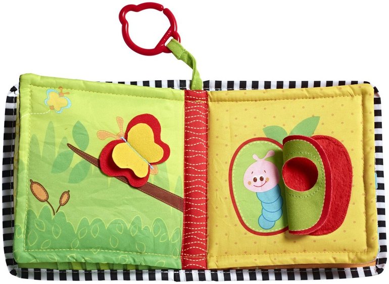 Так как мне часто приходится передвигаться за рулём, то для этих случаев очень зарекомендовали себя вот такие игрушки. Они легко крепятся на автомобильную люльку и надолго занимают дочку. 40 минут свободно она может бодрствовать и играть в них. Максимально мы использовали, когда время дороги занимало 4 часа. В книге 4 страницы с разными элементами.