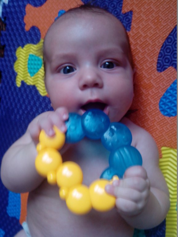 Мы окончательно перешли играться на пол, но долго лежать на животе ему не нравиться. Полюбил мобиль. И начал интересоваться резиновыми игрушками и грызунками.
