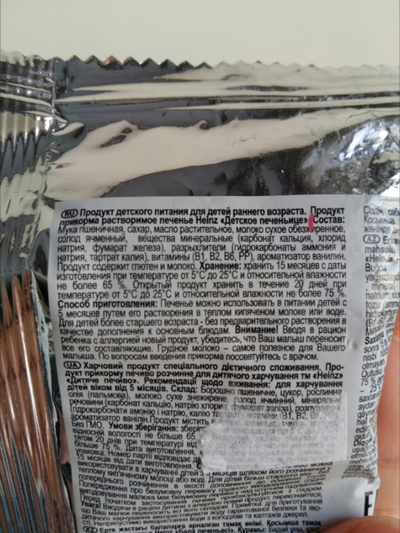 Если с Агушей более менее понятно. Как никак с 8 мес уже можно давать всякие несерьёзные вредности в виде ароматизаторов и красителей. То с Хайнц просто начинашь сомневаться в целой системе детского питания вообще. А вот и состав детского печенья Хайнц с 5 мес. Содержащее все "прелести" в одной упаковке. Ниже красной точкой отмечен состав.