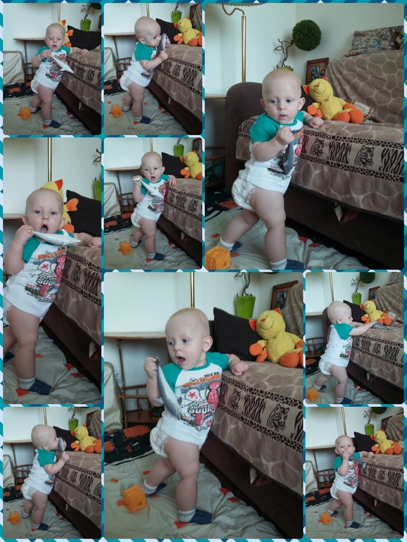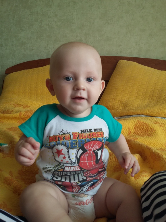 Вкратце: 9500, 72 см. 2 зуба есть, 2 конкретно на подходе. Сидит, встает и стоит у опоры с одной рукой (сегодня даже прошелся вдоль дивана). Ползает. Много звуков издает. Когда "плачет мне", говорит маааа, когда папе плачет, то почему-то бааа))) Едим по 30-50 г овощей на обед (кабачок, цветная капуста, броколли), и яблоко, банан, персик по чуть-чуть грызем утром или вечером. Но основное, конечно, молоко.