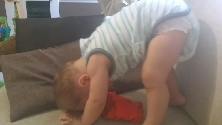 5. Становится на четвереньки, задирает попу и заглядывает вниз. Пытается оторвать ручки и встать.
