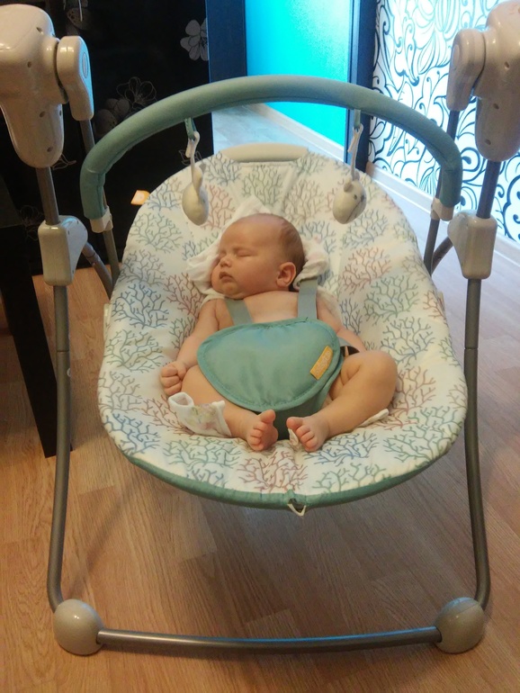 Купили ему качели в надежде освободить иногда маму, но не всегда нам там нравится, да и мне не нравится, как голова лежит, слишком глубокое место под попой.