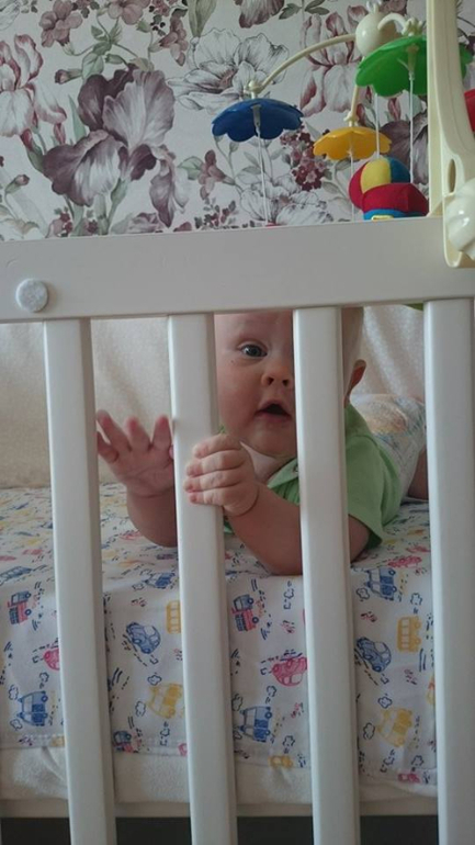 Вот в такой позе Данечка замирает, отпускает одну руку, а потом падает)) Не окрепли еще мышцы.