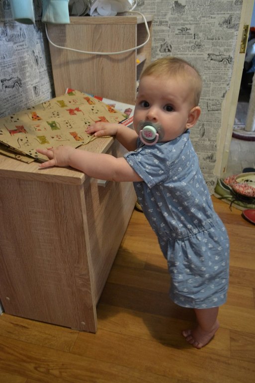 Она встает на ноги везде и всегда..первое время падала много,ну очень много(хотя я страховала),уже у меня глаз начало типать...я переживала.Регулярно говорила ей:держись крепче,показывала,что надо вместо падать просто присаживаться.