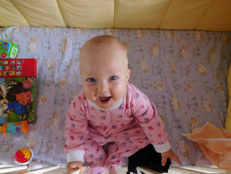 Физические умелки. За 8-9 месяца мы значительно продвинулись. Буквально 3 дня назад мы начали самостоятельно садиться. До этого сидела уверенно сама, но когда посадишь. А тут из положения лежа на животе, встает на четвереньки и попу опускает на пол. Но иногда ленится и просто плачет, что бы ее положение изменили.