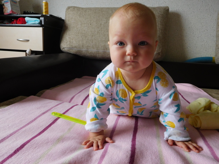 Пытается ползти. Пока может назад, но не уверенно. На диване иногда делает попытки ползти вперед, но буквально пару движений. Усложняют ситуацию капризы. Она все время хочет на ручки. Может такой период, а может характер. Иногда думаю пусть привыкает, но жалко, когда ноет.