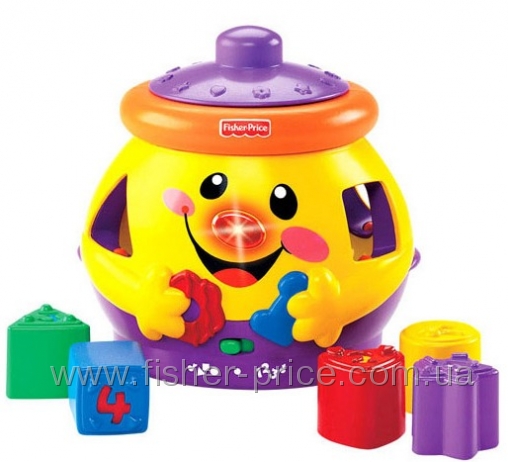 Нам 7.5 месяцев мы очень любим играть музыкальным горшочком Fisher price. Малышу очень нравиться открывать крышечку горшочка и доставать формочки оттуда. Как только малыш опускает туда ручку горшочек начинает петь. Складывать формочки в горшок пока не умеем. Горшочек выполняет функцию сортера, называет формы и цифры написанные на них. Ещё очень хорошая игрушка Умный щенок Fisher Price, он при нажатии на разные части тела называет их, поёт песни, рассказывает алфавит и все это на русском и английском языках.
