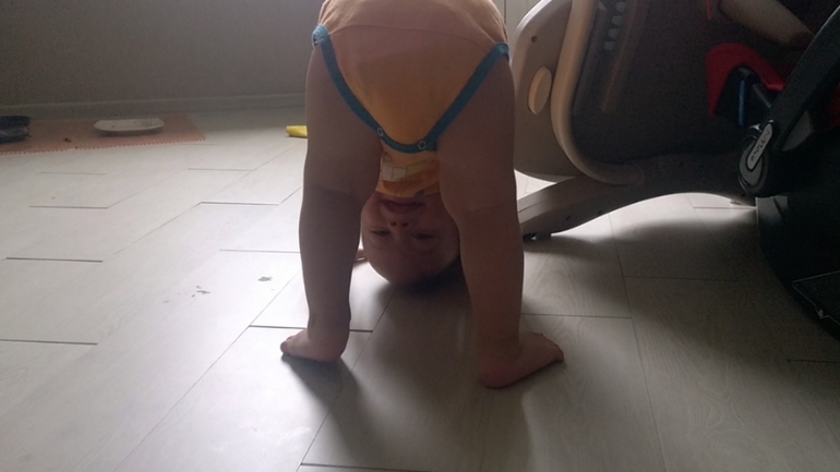 1. Встает с пола, с четверенек, с положения лежа.... в общем с любого положения без опоры. Идет, присаживается, берет новую игрушку и идет дальше. Может прям вскочить на ноги и побежать, куда ему нужно.