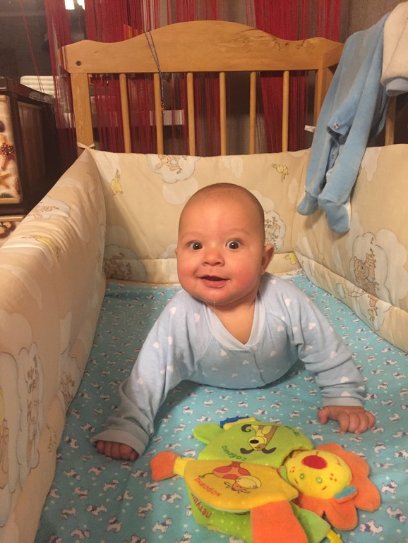 4,5 месяца, садится, напрягая пресс и цепляясь за все. Готов?