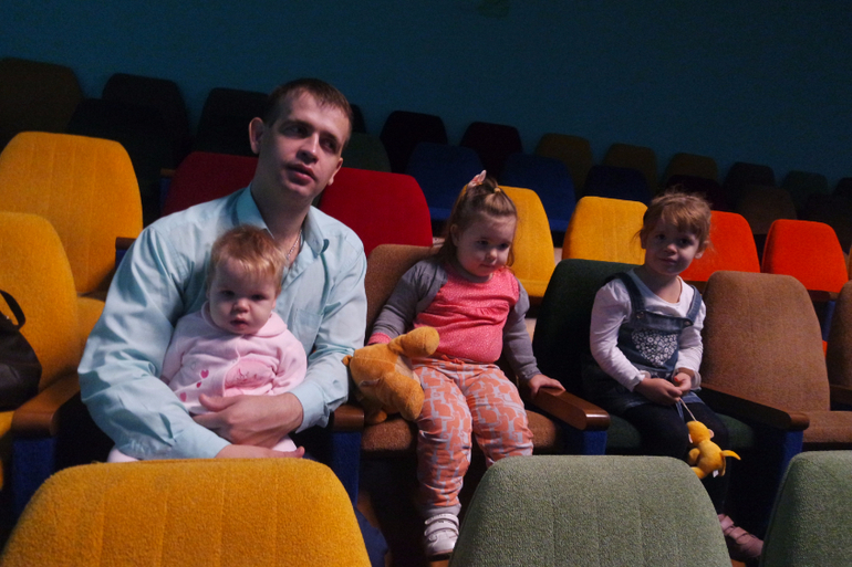 Мила впервые была в кукольном театре. Большую часть спектакля "Кошкин дом" проспала), но в начале выступления ей нравилось)