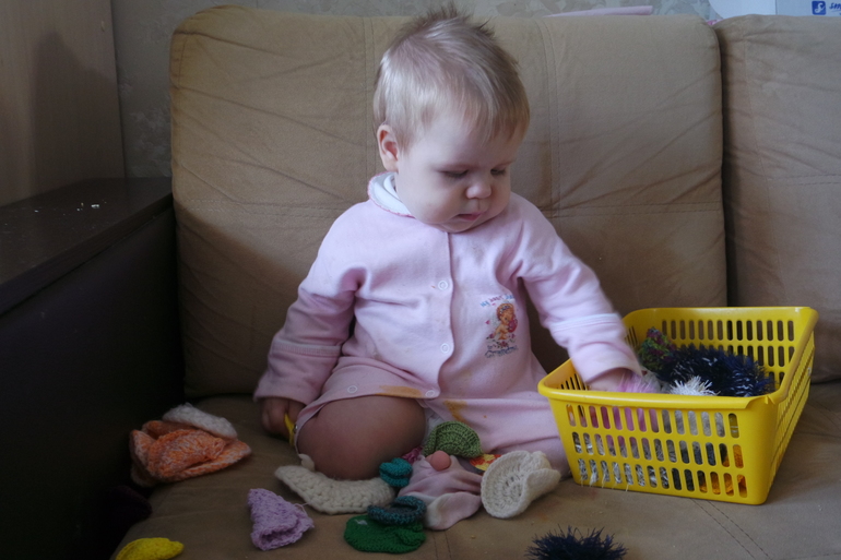 Мила долго сидит играет с коробками игрушек :выкладывает, перебирает, пробует на вкус, бросает, стучит...Был случай: Мила бросает по одной игрушке на пол ( а корзина была с мячами), я собрала с полу ( так как мячи разлетаются далеко от дивана) и положила на диван ... Мила зарычала и стала быстро их сталкивать назад))) А потом продолжила кидать оставшиеся мячи в корзине, но уже медленно и со вкусом)))