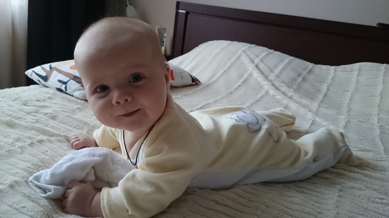 Читала где-то что сыновья даются маме чтобы защитить ее, а дочки в благодарность, так вот моя такая выстраданная дочка моя награда.... Мой золотой ребенок!!!! С первых дней жизни у нас установился режим, которого мы придерживаемся и это упрощает жизнь. Колики нас беспокоили первые 2,5 месяца, так же как и аллергия на молочный белок, сейчас все наладилось. Встаем утром часов в 9-10, в 12-13 на прогулке засыпает и спит часа 2, может вздремнуть минут 20 вечерком, в 20 у нас купание, это святое!!! В 21 она уже спит, кормлю пару раз ночью, спит она в своей кроватке, беру ее к себе под утро, когда папа уходит, иногда оставляю спать с нами, когда лень перекладывать. Умеет переворачиваться очень ловко на живот и на спину, встает на прямые локти и колени и раскачивается, ползет назад, играет в игрушки, перекладывает из руки в руку, с еется над нами в зеркале , не сосет соску, сосет пальчик, в стуле модет сидеть минут 15-20, играть в игрушки, в кроватке тоже может играть одна, главное мобиль чтобы пел и танцевал. Ну и конечно Эмилия уже упала с кровати и по правилу бутерброда головой вниз.... Как я испугалась!!!!! Теперь играет на полу и просто визжит от восторга!!!! Пока еще не пересели в прогулку, спит в люльке, если выйти в ее время гулять, если же мама протянула, то приходится носить на руках, но потом засыпает. Моя славная девочка дает маме готовить, убираться, а сколько мы с ней накрутили заготовок!!!! Мы же в отпуске!!!! Бабушки нам не помогают, да мы и не хотим особо.