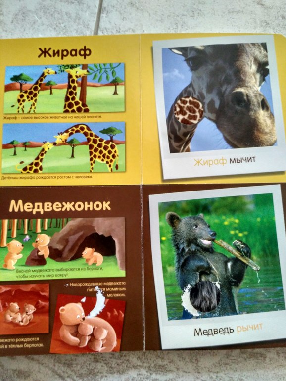 В каждой книжечке 4 разворота. На каждом развороте по одному животному. На одной страничке реалистичное фото с тактильной вставкой - шерсть, кожа, перья. На другой страничке рисунки о животном - образ жизни, питание.
