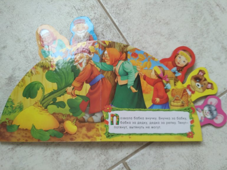 Что бы привлечь дочкино внимание к сюжету я когда читаю "тянут-потянут" тоже тяну Дашу, это ей очень нравится!! В общем книжечку читаем 2-3 раза в день!!