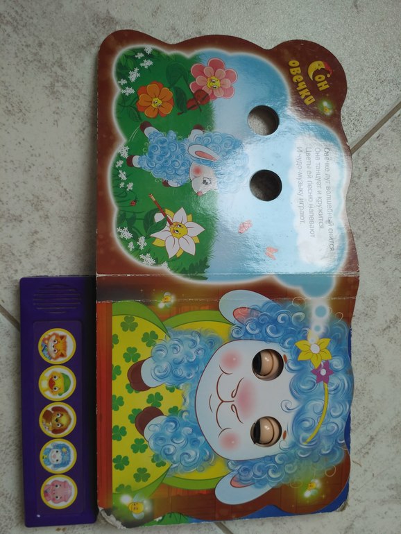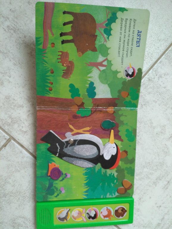 Книга с подвижными элементами и со звуком. Но батарейки у нас сели, поменять все время забываю поэтому я читаю. Но звук нравится приятный голос читает четверостишье, потом звук животного- вой волка, стук дятла и т.д.