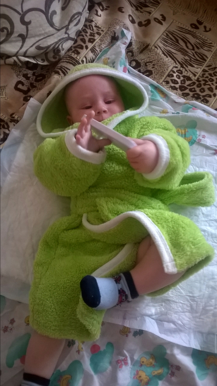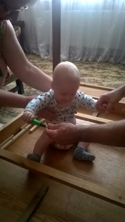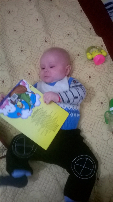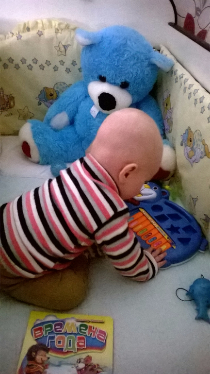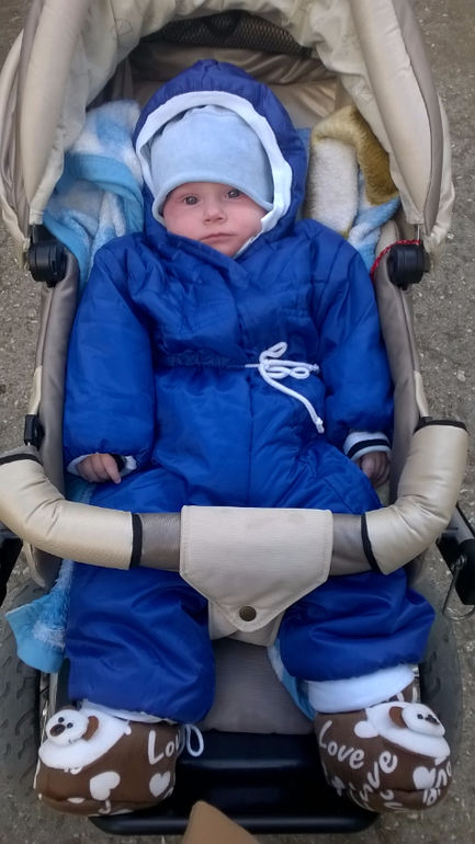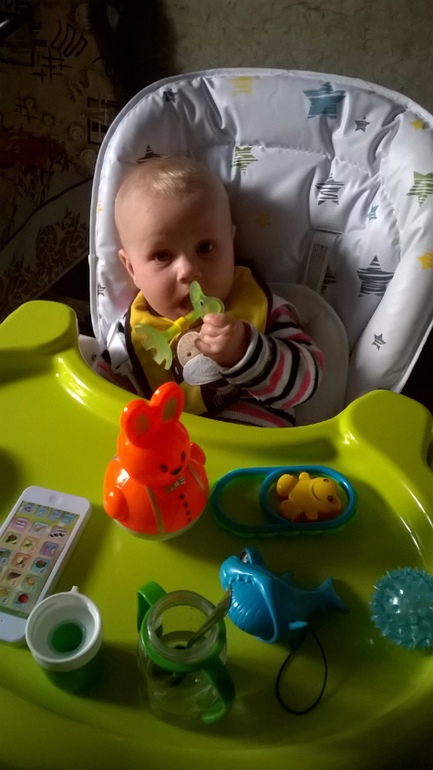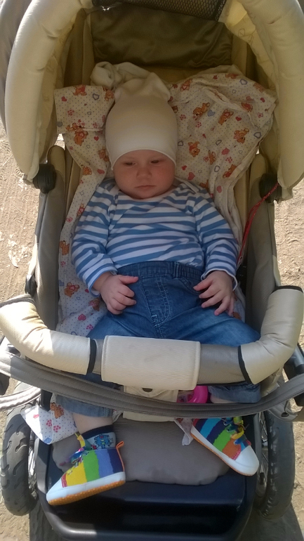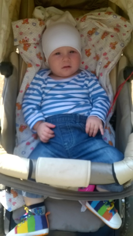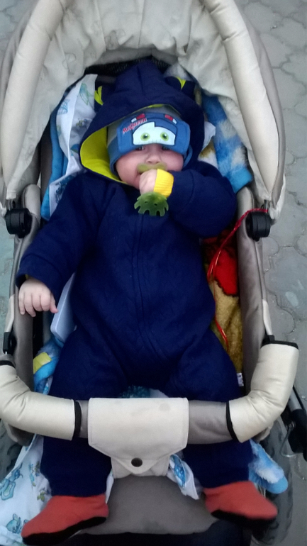 Сидит, ползает, пытается вставать, не находит обо что опереться - психует. Забрали игрушку-психует, не дали игрушку- психует. Взрослый парень уже, многое понимает. Любит играть со всем, что не игрушки: коробки, баночки, бутылки, тюбики всякие и т.д. Полюбили кататься в коляске как начал сидеть. Глазеет по сторонам. Любит смотреть на знаки. Наблюдает за кошками, собаками. Снова спит на улице.Ура. Хотя нам и так уже стало интересно. Спит днём 3 раза. Ночью плохо вторую половину. Часто сосет грудь. Без груди обратно не засыпает, если проснулся. Упал...Ночью...Я в шоке была. С краю спал.Упал вместе с одеялом, которое на край ставила. Больше не спит там. Только посередине. Приучаю к кроватке. А так не хочется. Нам хорошо вдвоем. Не представляю, когда отлучать от груди буду. Мы в эти моменты одно целое. В год планирую. Уже не могу на диете.Психую, сладкого хочется. Может наладится все. Ест грудь в любой позе. Так интересно- лёжа, сидя, на животе, тянется к соску. Вроде по чуть начинает есть прикорм, но все равно не особо.Буду давать, то что ем сама. Так мило тянет руки к тебе, когда зовешь. Идёт ко всем, никого не боится. Набил себе первый фингал по глазом. Играл с игрушкой, уронил. Синячок маленький. Люблю безумно свое солнышко. Не описать словами. Жалко, что холодает. будем дома больше.Сидит в стульчике, когда готовлю. Ремонт все почти, ура на пол пойдет ползать. Хотя самого так не оставишь. Вроде все. Как всегда быстрый пост. А говорит Иди, Уйди, и много всяких своих слов. И наши фото за месяц.