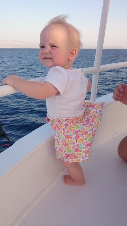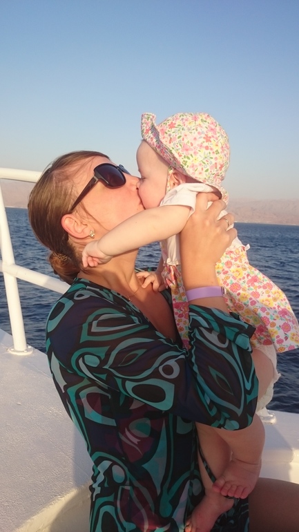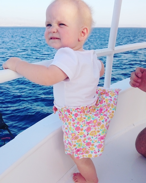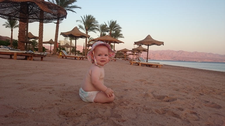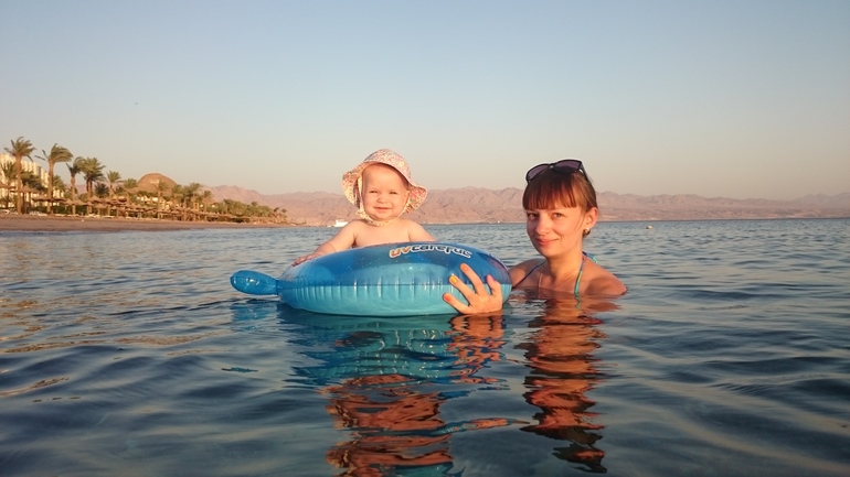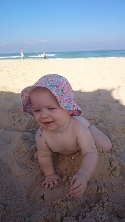 Первые 2 ночи на новом месте она очень плохо спала, видимо, сказывалась аклиматизация и вообще смена обстановки. Но к отъезду в Египет все наладилось. Средиземное море (до него идти было 5 минут от родсвенников, у которых мы жили) Лере понравилось, правда, были волны и в основном она ползала на песке. Всегда ползла к морю, плюхала ручками по воде и радовалась)))