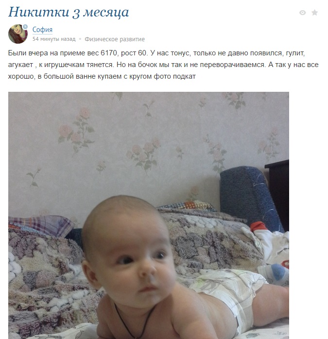 Физическое развитиеБыли вчера на приеме вес 6170, рост 60. У нас тонус, только не давно появился, гулит, агукает , к игрушечкам тянется. Но на бочок мы так и не переворачиваемся. А так у нас все хорошо, в большой ванне купаем с кругом фото подкат