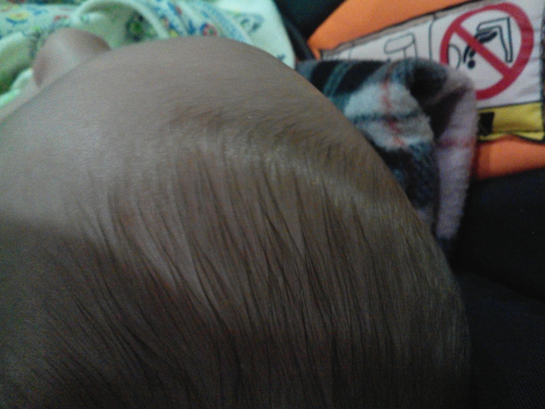 У нас не полоса,а прям пятак лысый на макушке, мне кажется врач стерла резиновой перчаткой когда вытаскивала.А у вас не пойму,при рождении не было этой полоски?Я не помню ты сама рожала или кс?Может тоже шрамик от инструментов остался?