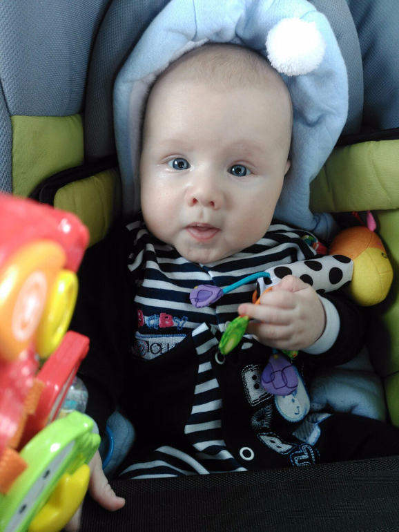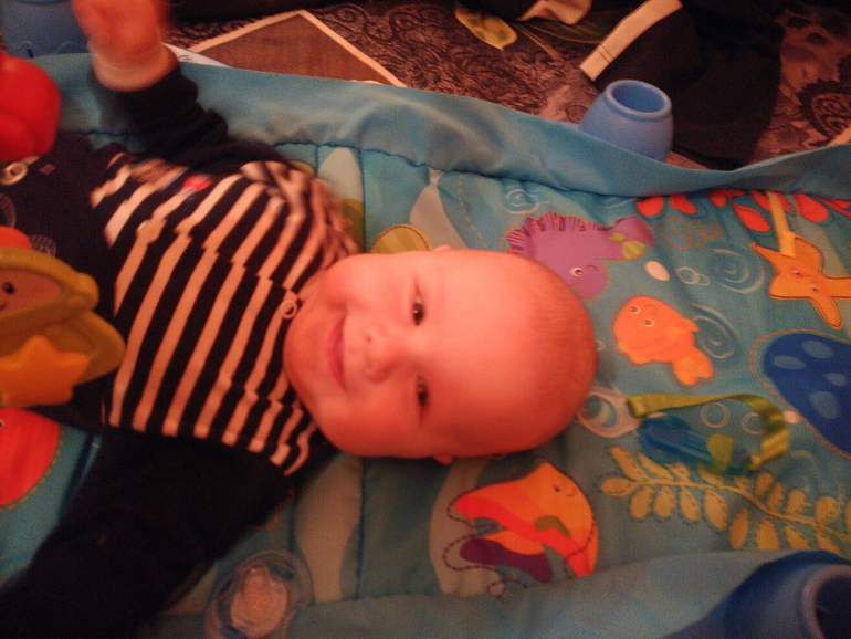 Сегодня мы вернулись домой, я занесла Сашу домой, раздела, положила на пеленку и спрашиваю "ну что, Сань, ты дома!узнаешь?" и он как начал смеяться!!!В голос!Первый раз он так закатывался смехом - мой взрослеющий улыбасик!