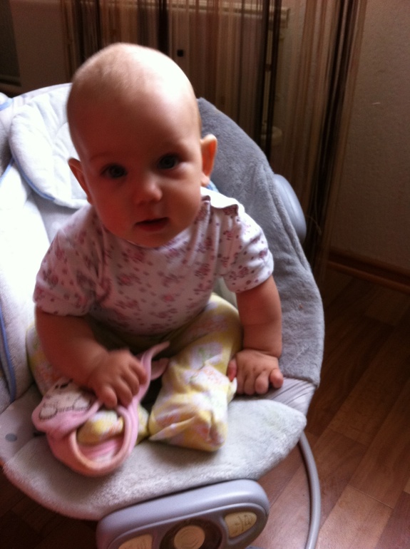 Стала на локтях сидеть, не хочет ложится в качельке, сегодня смотрю она прям спину оторвала в качелях и сидит, деловая) это конечно не считается что села, но все-равно для нас новая умелка!