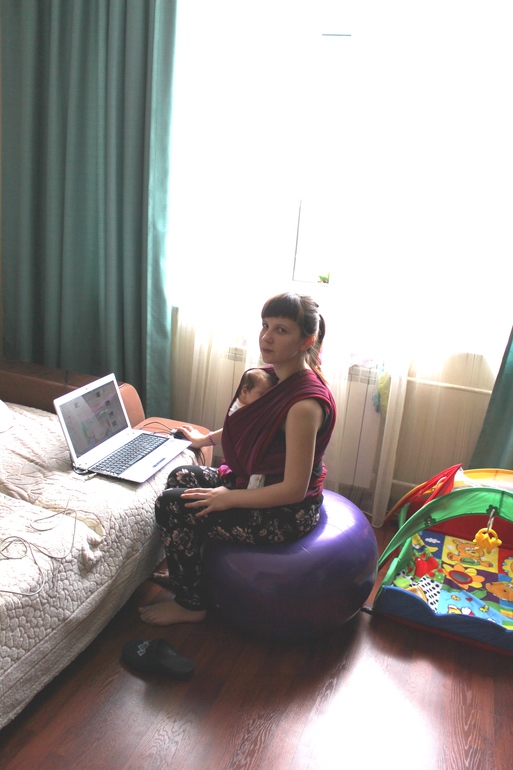 А это так мы сидим за компьютером в слинге и на любимом фитболе.
