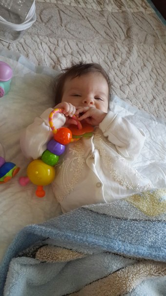 Вчера заметила за ней, что она лучше осознает свои ручки. Я ей дала в ручку поргемушку. Она схватила, понесла в ротик и принялась грызть.