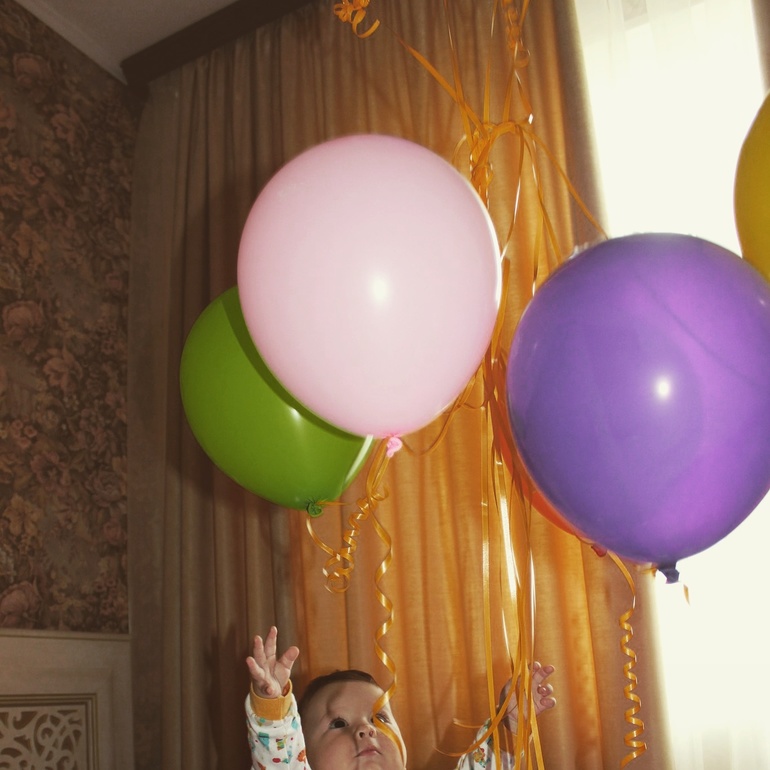 В этом месяце мы наконец крестили Мишу. Гости среди прочих подарков (провославной тематики) принесли любимые Мишей воздушные шарики. Миша очень любит с ними играть, но я всегда боюсь что шарик лопнет и напугает ребёнка, поэтому играет Миша с шариками под моим присмотром.