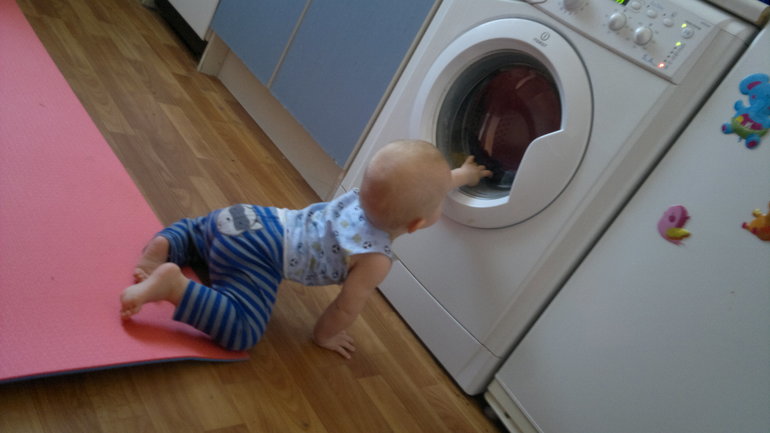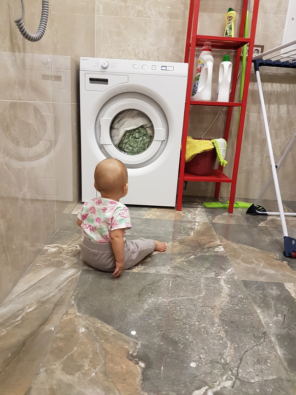 На 5-10 минут ребёнка не слышно. Она завороженно созерцает как вращается барабан стиральной машины. Загадочный микрокосмос чистого белья.... И пол с подогревом приятно расслабляет...