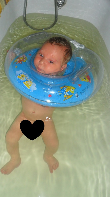 Любит купаться в ванной в круге, очень упорно старается плыть (даже когда уперся в бортик, то аж подпрыгивает))). Плавает с серьезным лицом, но иногда давит лыбу. Вот наше первое купание