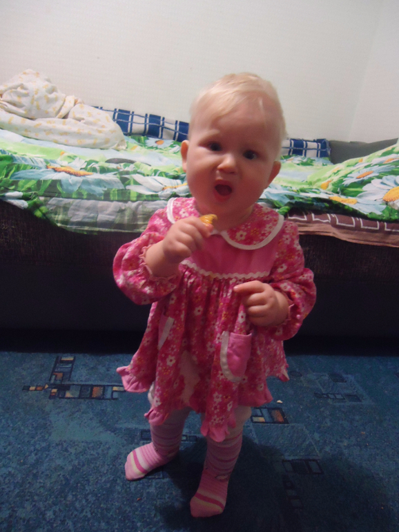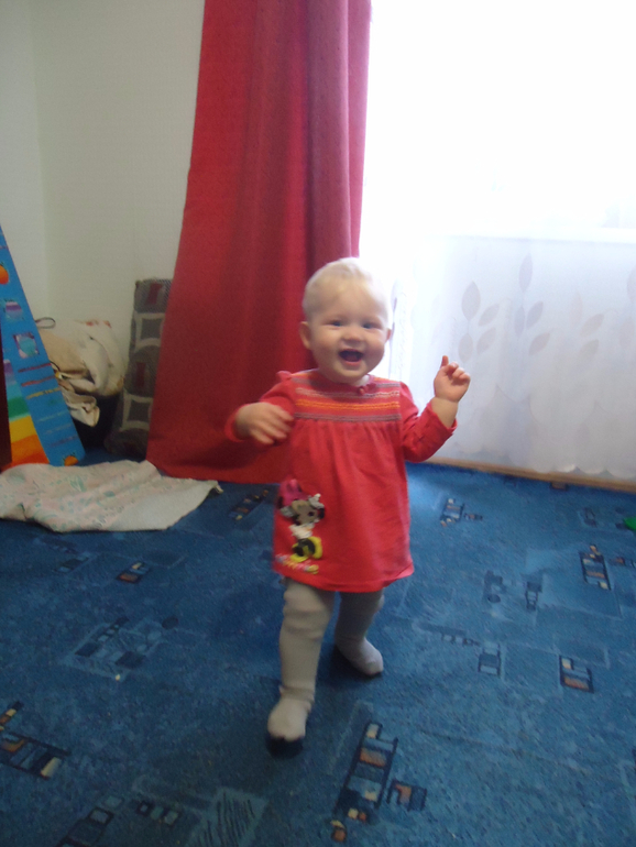 Появилась ревность. Когда мама с кем-то разговаривает, начинает психовать. Стала осторожничать не только с чужими но и со своими. Бывает плачет и на бабу с дедом. Любит играться с одеждой( особенно колготки), в "догоню,догоню", и прятаться за шторки. Говорит на торобарском. Из самого понятного только "дать" и "мама", когда плачет. Любит шуметь, кричать. И начала кусаться.