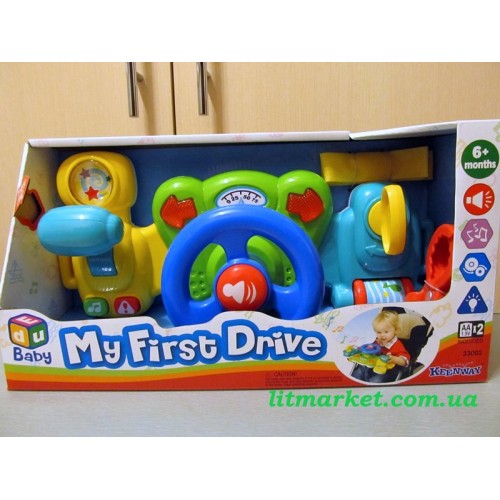 У нас вот такой. Он со звуковым эффектами: звук мотора, сигнал, рычаг трещит и там крутится картинка) Ещё кнопочки звуки разные издают. Он с помощью липучек крепится на коляску