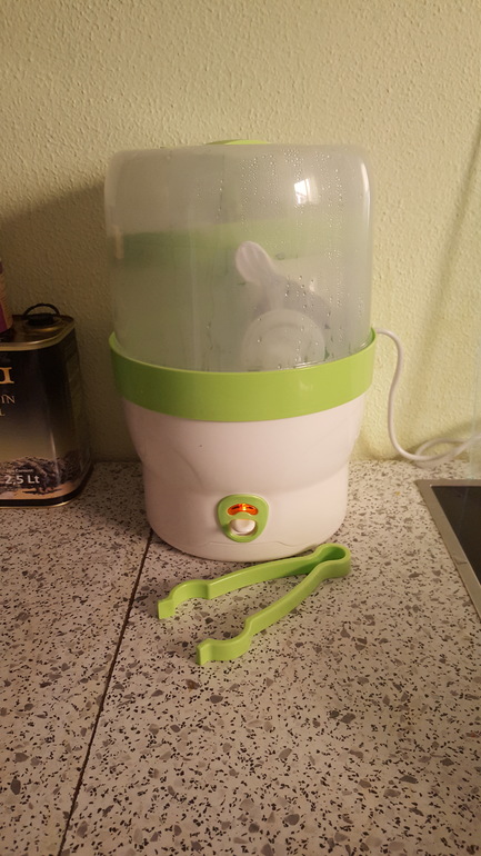Стерелизатор. Тоже не дорогой,25 евро с доставкой. Покупался там же,где и увлажнитель. Паровой,работает от сети. Изначально,хотела купить Авент...но стоил он 80 евро,честно,зажала я денег. Но этой покупочкой тоже довольна.Вмещает в себя 6 бутылок,соски и соски на бутылочки. Я еще смогла впихнуть молокотсос. Работает 11 минут и отключается самостоятельно