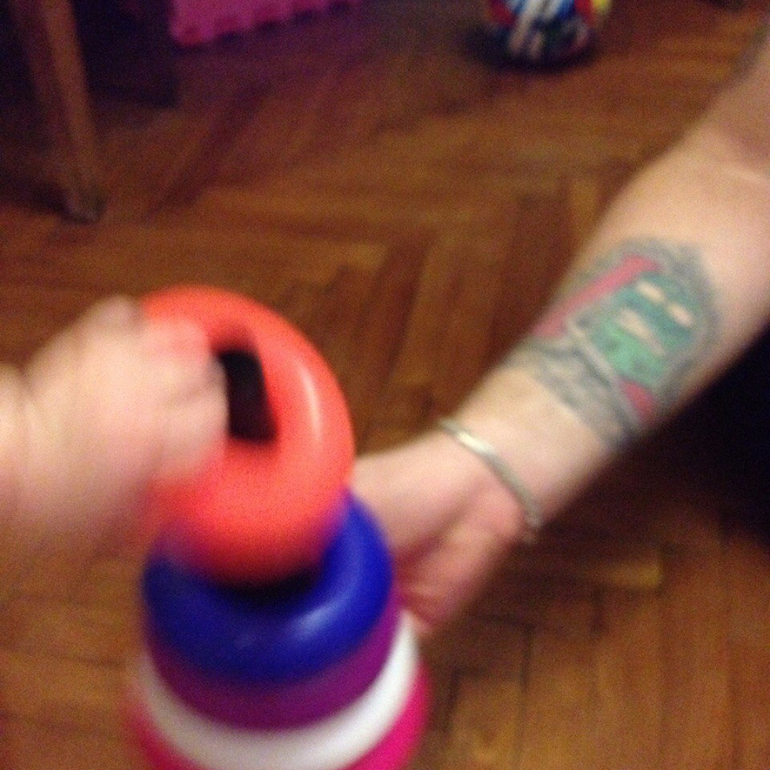 Дочке год и она, если показать и поуговаривать, может одно колечко надеть. Ей просто не нравится это занятие. И вообще, это миф какой-то, что ребенок должен сам собирать всю пирамидку к году