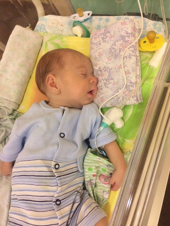 Всю ночь Максим рвал зеленью, когда мне говорили, что это нормально. Утром к нам пришли, соответственно, на осмотр, забили тревогу так, как у Максима был живот "камень". Сразу же пошли делать рентген и УЗИ, диагноз непроходимость кишечника. В тот же день сделали операцию, 5-ти часовую, наложили стому(то есть вывели тонкий кишечник наружу, куда потом клеется калоприёмник, а толстый оставили закрытым внутри), перевели в реанимацию и поставили на ИВЛ. Мне говорили, что Максим очень маленький и слабый, и неизвестно задышит он сам или нет. На следующий день мы покрестили Максима прям в реанимации. Мой маленький, но очень сильный мальчик задышал сам уже на второй день, но его ещё сутки держали на ИВЛ как помощь ему. И тут мне начали объяснять, что у Максима осталось 10 см тонкого кишечника (когда в нормальном случае у новорожденного минимум 120 см), что такие дети не живут и всякой всякой гадости. Я была разбита, я не понимала, что делать дальше и как спасти моего мальчика. Каждый день ходила к Максиму в реанимацию, старалась не плакать, я была благодарна Господу Богу за каждый день который он живёт. И вдруг мне говорят ложиться в отделение, что я начну кормить своего мальчика. Моему счастью не было предела, на тот момент я была самым счастливым человеком. На следующий день с самого утра я уже была в реанимации, поднялась в отделение получила место сцедилась и опять спустилась к Максиму. Начали кормить через зонд по 5 мл. Очень сложно начинали кушать, рвали зеленью, когда желчью с молоком, все возвращалось. Три недели стараний, и вот! мы кушаем 25 мл, переодически рвём, но не так, как раньше. Все время Максим лежал с закрытыми глазами, лежал практически не шевелясь, даже рвал и не плакал. Уже пошли разговоры о переводе Максима в отделение, ну и на 4 неделе жизни Максима решились перевести ко мне. В тот же вечер Максим первый раз открыл глазки, я увидела его голубые большие глазюки. Меня переполняли эмоции, я плакала, но уже от счастья. В отделении Максим потерял вес, очень сильно, при переводе мы весили 3100, в отделении мы скинули до 2500, потом ещё 200 скинули. Врачи ничего не делали. Как потом я поняла, в реанимации нам ставили парентеральное питание(глюкозу,жиры и аминокислоты), в отделении нам капельницы не ставили. Кушали мы по 30 мл и так, как у нас кишечник короткий, как только мы ели через минут 20 уже все вытекало(как зашло, так и вышло), питательные вещества не успевали всасываться. Максим был истощён, он увидал на моих глазах, он постоянно спал, не открывал глаза, мне было страшно, страшно за завтрашний день, не описать словами. Врачи начали готовить его к операции, закрывать кишечник(то есть соединить тонкий с толстым). Перевели в реанимацию и начали ставить круглосуточные капельницы с внутривенным питанием. На операцию мы пошли с весом 2600, нам было 1,5 месяца. Операция длилась 4 часа и опять реанимация, опять ИВЛ. После операции мне говорили, что кишечник может и не заработать, что у него мало шансов, что это чудо что Максим ещё живой(это звучало так, что мы его вроде лечим, но странно что он ещё выжил от нашего лечения) и так далее, потом как оказалось это всего лишь бред недоучек, недоврачей. Мне сказали, что первый кал должен быть через 3 дня, прошло 3 дня все глухо, 4 день -мимо, 5 день -мимо, 6 день -...., 7 день - с слезами на глазах стою над Максимом, он спит, лезу в памперс, а там п