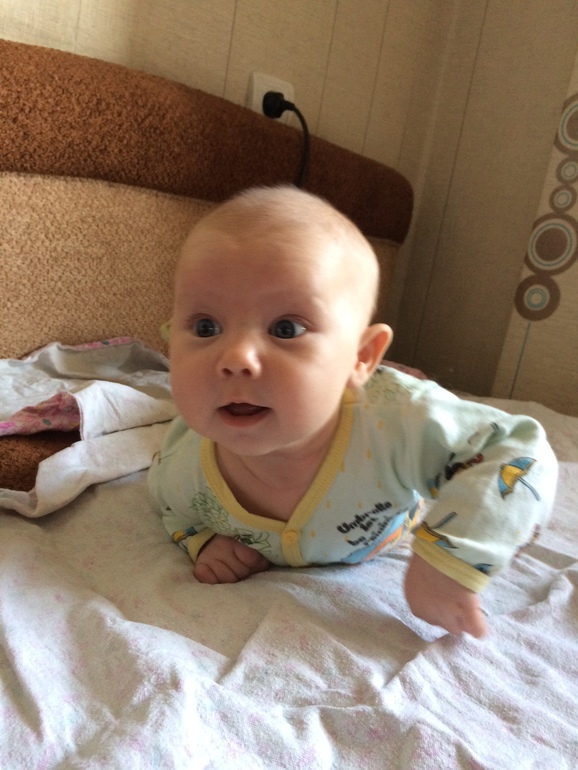 Голову держит вроде нормально, правда не любит на пузе лежать. Хватает ее на минут пять, а потом начинает облизывать кулачки и пеленку)))