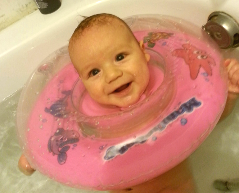 Продолжаем ходить с ним в бассейн. Плавать обожает! Самое любимое его занятие! В воде готов сидеть часами. 2-3 раза в неделю кайфуем с ним. Потом очень хорошо кушает и очень крепко спит )) Дома купаемся в большой ванне- полчаса с кругом на шее и потом ещё минут 20 без круга. Вода 31-30 градусов.
