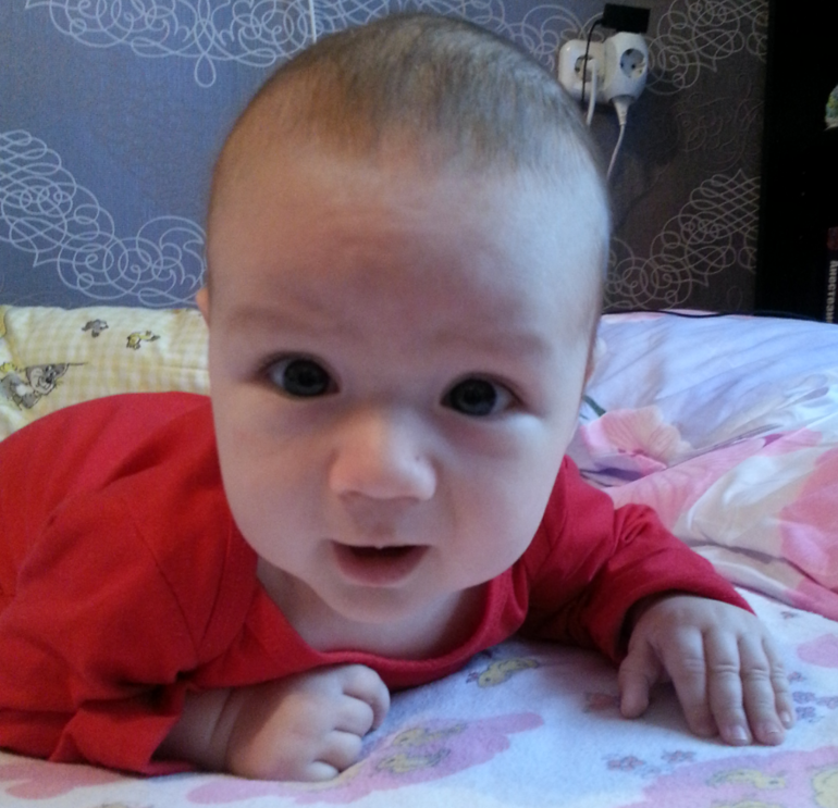 Умеет хорошо держать голову лёжа на пузе и вертикально на руках. Приподнимается на вытянутые ручки на несколько секунд, из положения лёжа пытается сесть- выглядит как качание пресса ))