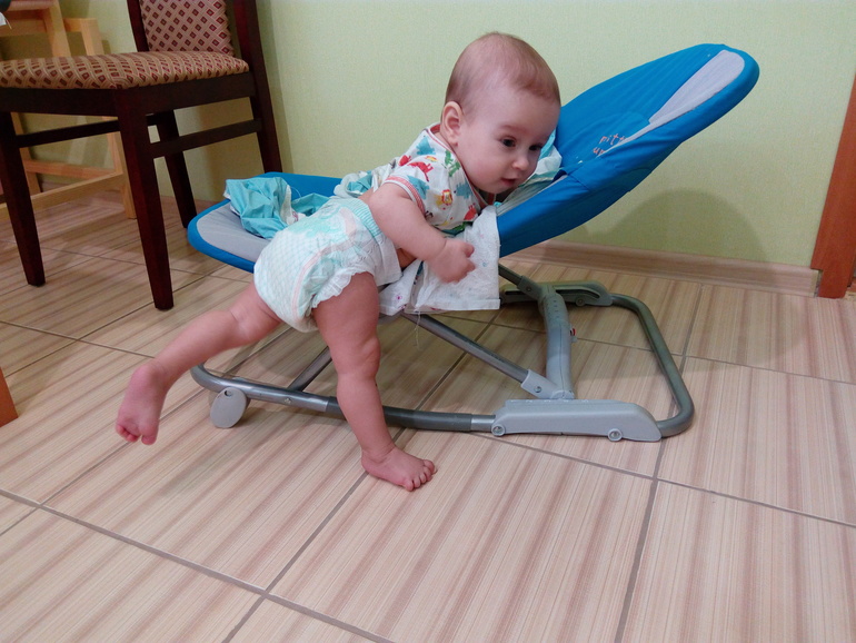 За это время столько всего нового произошло! Я уже умею быстро ползать на четвереньках, вставать на ножки, правда с опорой, немножко сидеть без поддержки ( сама сажусь))) за это мне подарили очень красивый стульчик со столиком. Урааа!!!