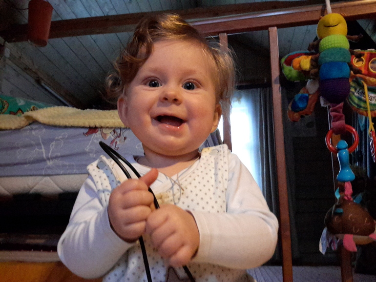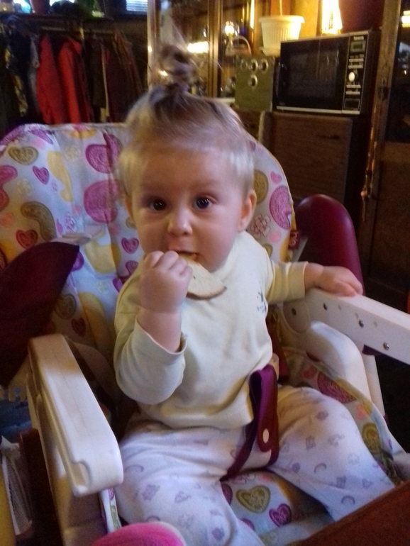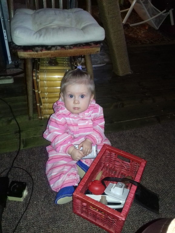 Из игр любит всякие коробки/корзины/тазы, из которых можно что-нибудь долго и со смаком повыбрасывать. Последние пару дней некоторые предметы стала возвращать на свои места. Нравится электроная уточка, хлопает в ладоши, когда та поет. Любит залезать и слезать на небольшие возвышенности: в игровой зоне лежит паралоновый матрас на полу высотой 10-12 см...вот там она может долго протусить. Стала отпускать ручки, когда стоит у опоры, но не на долго. Слабовата еще, я вижу. Но тренируется, молодец! Ползать шустро стала, крутится-вертится, как юла. Научилась спать на животе. Мы с ней вдвоем спим, папа месяц уже как выселился из-за зубов. Их, кстати, четыре: нижние центральные резцы и верхние боковые. Верхние центральные на подходе. Так что " Чип и Дейл спешат на помощь")))) С прорезыванием верхних зубов отказалась от соски, которую посасывала с месячного возраста на сон. Было удобно....укачала с сосой и в кроватку, дитя спит до кормления или пока соска не выпадет. Покормила, сосу дала и дальше баиньки. Эхххх....теперь вместо соски ночью всегда грудь. Днем тоже с грудью укладываю, просто на руках только в машине, ну и в коляске на прогулке засыпает без всего.