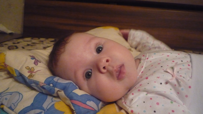 Зубы, которые показались месяц назад, так и не вылезли. Слюни рекой. Вся одежда мокрая. Девочка у нас лентяйка. Игрушки так и не хочет брать( Изредка соизволит дотронуться до них. Переворачивается только с живота на спину. А со спины получается только на бочок, а дальше никак. Начинает капризничать, чтобы помогли. Помогаю. Но и на животе лежать не хочет. Вот если бы носили ее все время))) Режима со сном нет. Спим по-разному. Можем и 2 часа поспать, но это стало так редко. Тогда в течении дня практически не спит( Обычно минут по 20 спит. На улице тоже перестала долго спать.